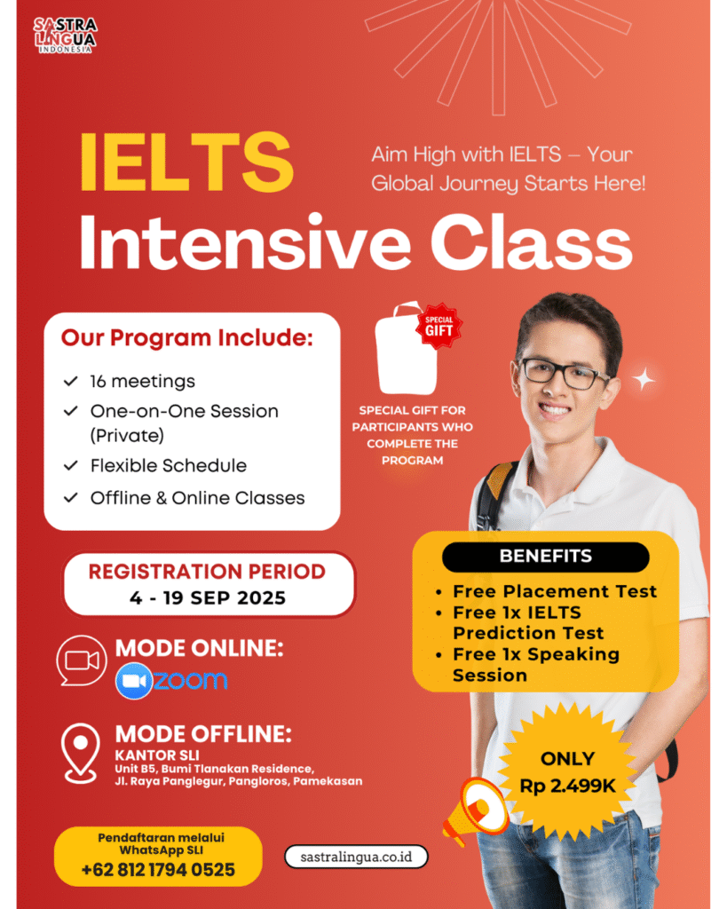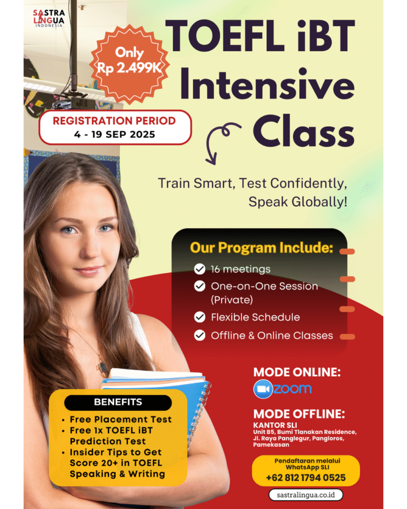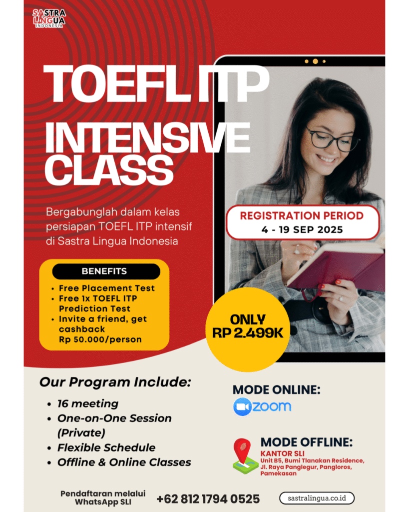 Untuk informasi lebih lanjut tentang layanan TOEFL/IELTS Preparation Class, bisa menghubungi Sastra Lingua Indonesia di melalui HOTLINE SLI: https://wa.me/6281217940525.