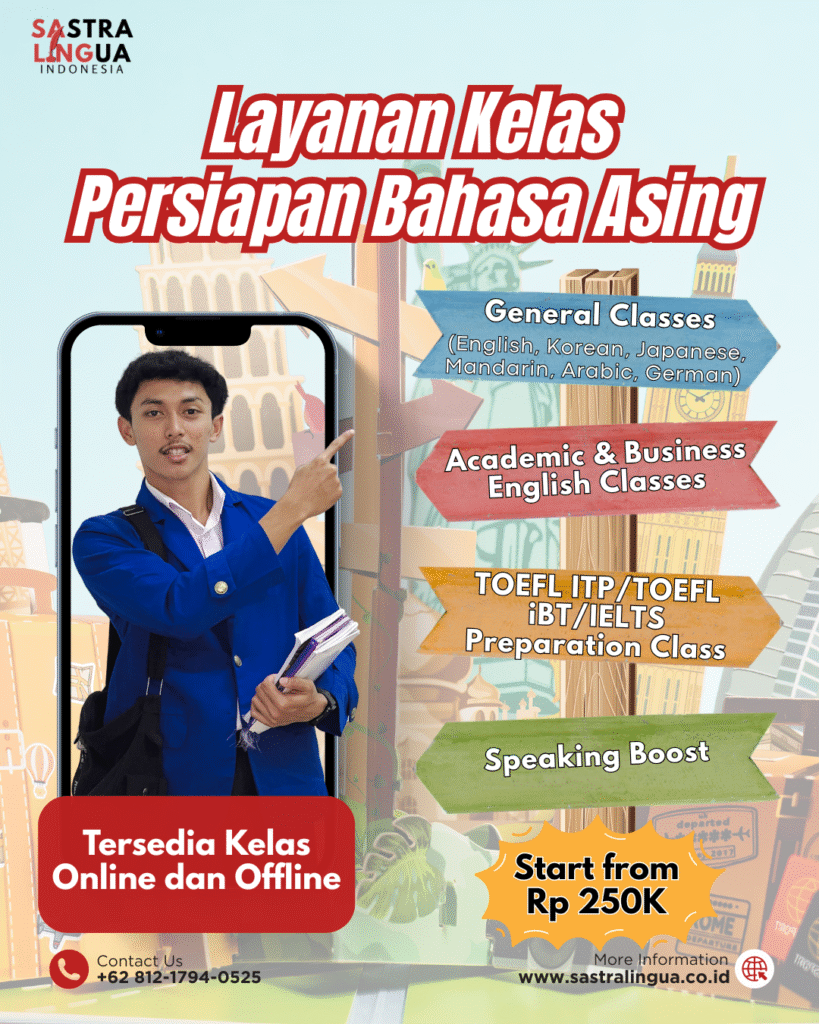 Public speaker yang bisa berpindah dari bahasa Indonesia ke bahasa Inggris (atau sebaliknya) tanpa kehilangan makna, akan terlihat profesional dan kompeten. Kemampuan seperti ini menunjukkan bahwa kita bukan hanya bisa bahasa Indonesia dengan baik, tetapi juga bisa bahasa Inggris secara lancar.Program Speaking di Sastra Lingua Indonesia cocok untuk kalian yang sedang belajar meningkatkan kemampuan public speaking dalam bahasa Inggris. Kami menyediakan periode belajar yang adaptif dengan kebutuhan siswa. Daftarkan segera dirimu ke program speaking di Sastra Lingua Indonesia! Ingin belajar topik-topik tertentu di kelas privat juga bisa! Segera hubungi Sastra Lingua Indonesia melalui Hotline WhatsApp kami!