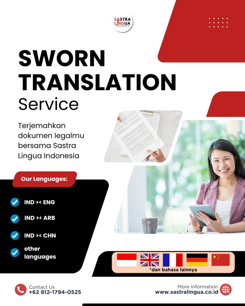 Untuk layanan terjemahan tersumpah yang cepat, akurat, dan sesuai standar hukum internasional, percayakan pada Sastra Lingua Indonesia. Kami juga menyediakan layanan legalisasi dan apostille untuk memastikan dokumen Anda siap digunakan di luar negeri. Hubungi HOTLINE SLI: https://wa.me/6281217940525